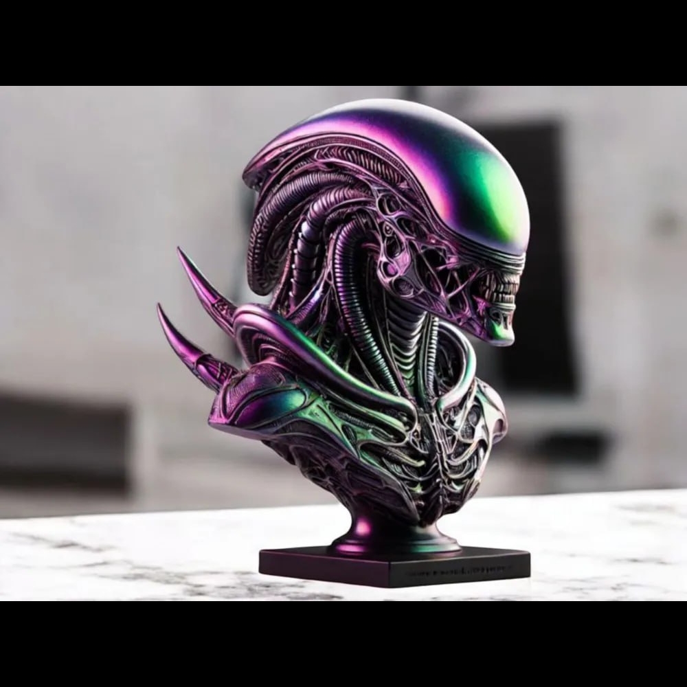 Limited-edition Scorched Xenomorph life-size bust, sculpted from original 3D files, hand-painted with extreme detail—21″ tall, 17″ wide, 33″ deep.